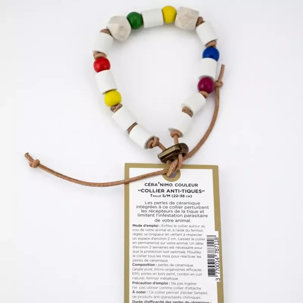 Les perles de céramique intégrées au collier perturbent les récepteurs de la tique, ce qui l’empêche de détecter le chien. Elles limitent l'infestation parasitaire et permettent de diminuer les applications de produit anti-parasitaire. Le collier existe en trois taille : XS - Mini : pour un tour de cou de 15-25 cm S - M : pour un tour de cou de 22-38 cm L - XL : pour un tour de cou de 38-60 cm Indication supplémentaire : Comme n'importe quel collier pour animal domestique, une fois sorti du pochon, enfilez-le autour du cou de votre animal et, à l'aide du fermoir, réglez sa longueur en veillant à respecter un espace d'environ 2 cm entre le cou et le collier. Durée d'efficacité: Le cordon: environ 2 ans. Les perles : environ 10 ans. Eco-Friendly Objectif Zéro déchet (Notre produit permet de remplacer des produits jetables / Notre produit est recyclable / Son emballage est recyclable ou peut avoir une nouvelle utilisation) Cruelty free